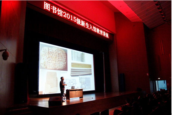 图书馆入馆教育是大学生入学教育的重要组成部分,目的在于引导新生养成良好的阅读习惯,科学有效地使用图书馆。校区图书馆于9月17日开始面向2015级新生推出系列入馆教育活动。17日首场讲座的题目为《图书馆的魅力》,由校区党工委副书记兼管委会副主任郭金明担当主讲嘉宾,讲座在E03大礼堂分为两次面向1400名新生举行,讲座由图书馆馆员王萌主持。