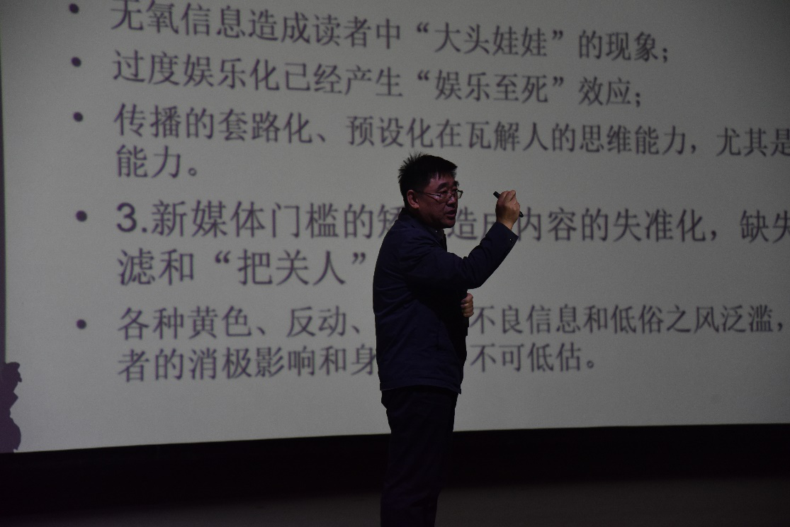 郭金明首先围绕当代社会阅读现状展开讲解,他以丰富的数据告诉同学们,目前,我们已经进入新媒体阅读时代,超过半数成年人更倾向于数字化阅读,受制于时间、地点等诸多不确定因素影响,碎片化阅读成为普遍的阅读方式,一定程度上造成了读者对阅读内容的一知半解、囫囵吞枣等负面效应。郭金明通过比对国内外高校图书馆书籍借阅数据的比较研究,深入浅出的分析了中外大学生在阅读内容上的差异化特点,以及造成这种差异的原因。