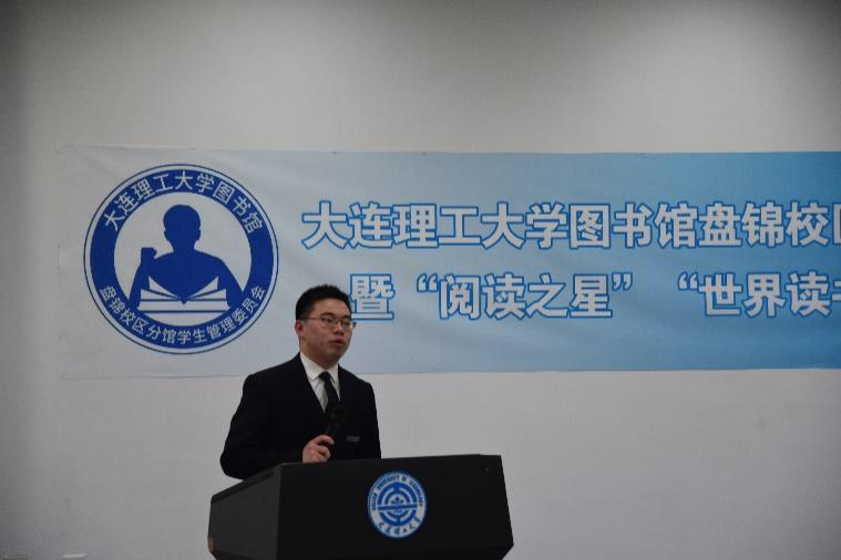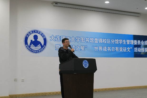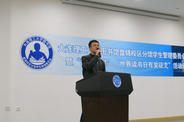 首先是图书馆盘锦校区分馆馆长麻海博和校区学生事务办公室副主任兼团工委书记付成龙分别做了讲话。肯定了学生工作者在图书馆管理工作中的重要作用,也强调了读书的重要意义,鼓励同学们多读书、读好书。