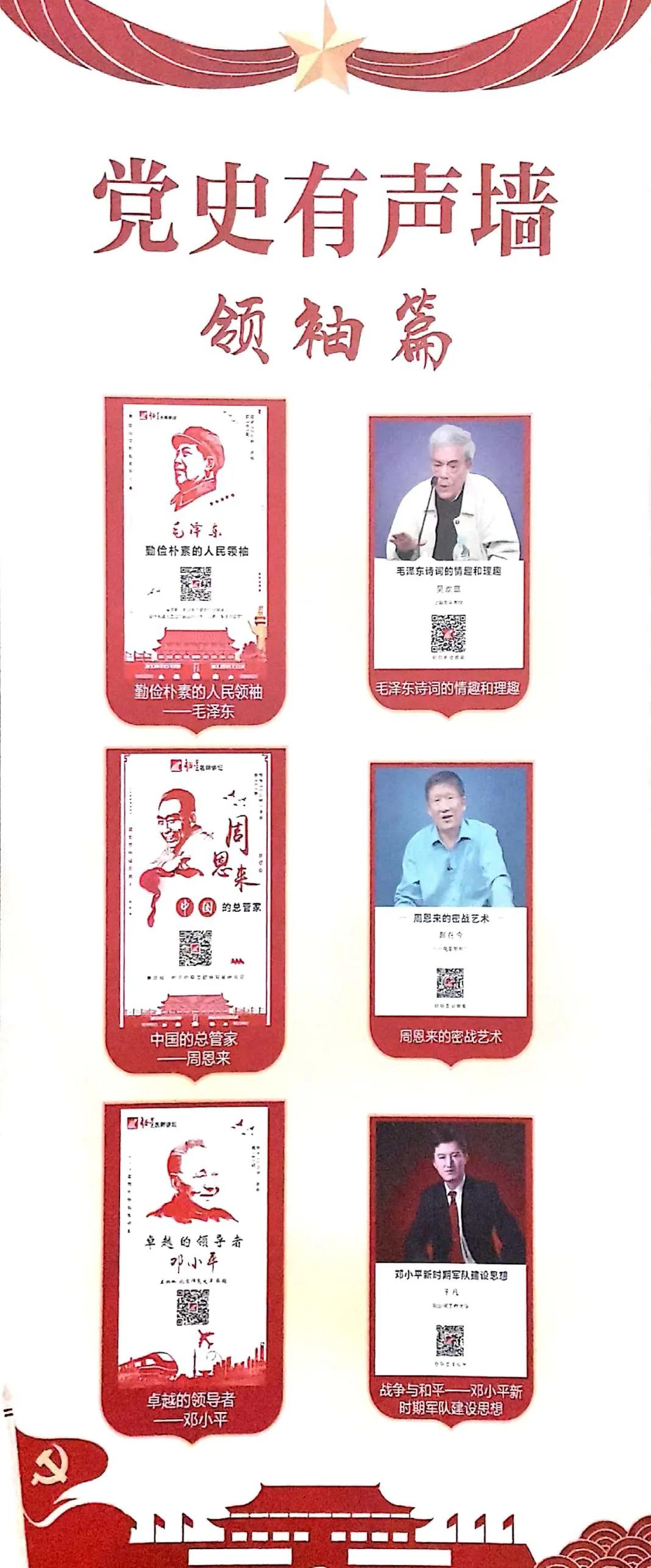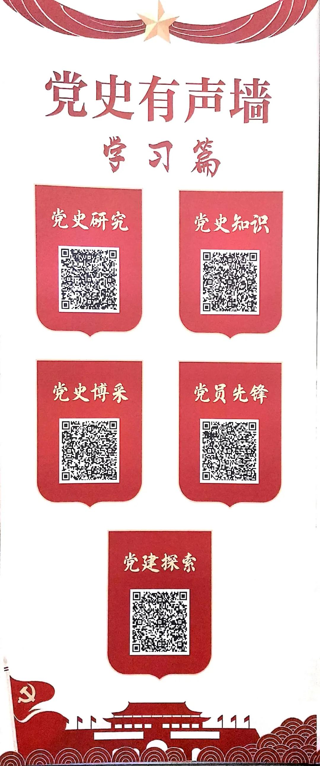 为创新党史学习新模式,打造“有声微课堂”,党史文献展厅特设立党史有声墙。内容上分为领袖,学习,廉政,发展四个板块,以二维码形式呈现,只需扫码即可进入所选板块,收听相应内容,打通了党史学习的“最后一公里”。