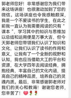 更有学生在讲座之后对郭金明教授私信表达了支持与肯定,学生表示讲座内容激发了他对阅读的思考,拓宽了他的视野,赞扬了郭金明教授的知识渊博和教育热情,表达了自己的感激之情。郭金明教授也对学生的认可表示了感谢,并表示师生之间共同努力,未来一定更为美好。