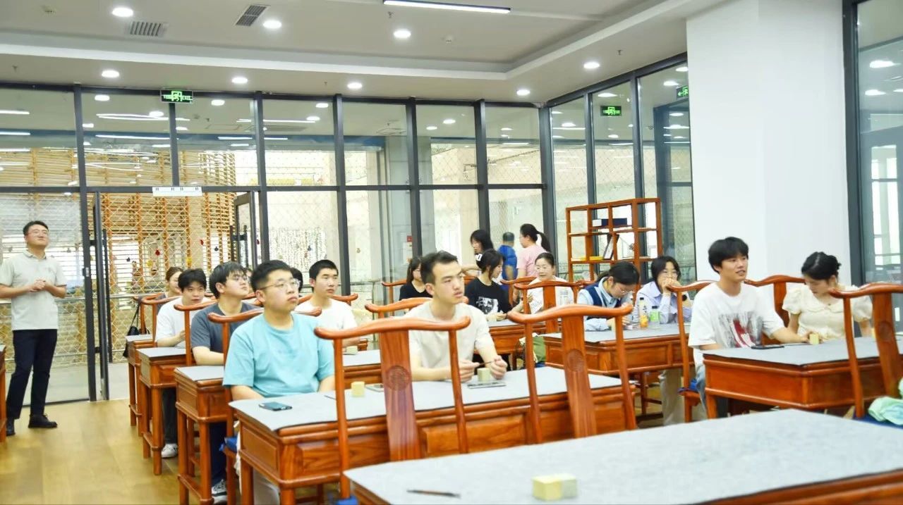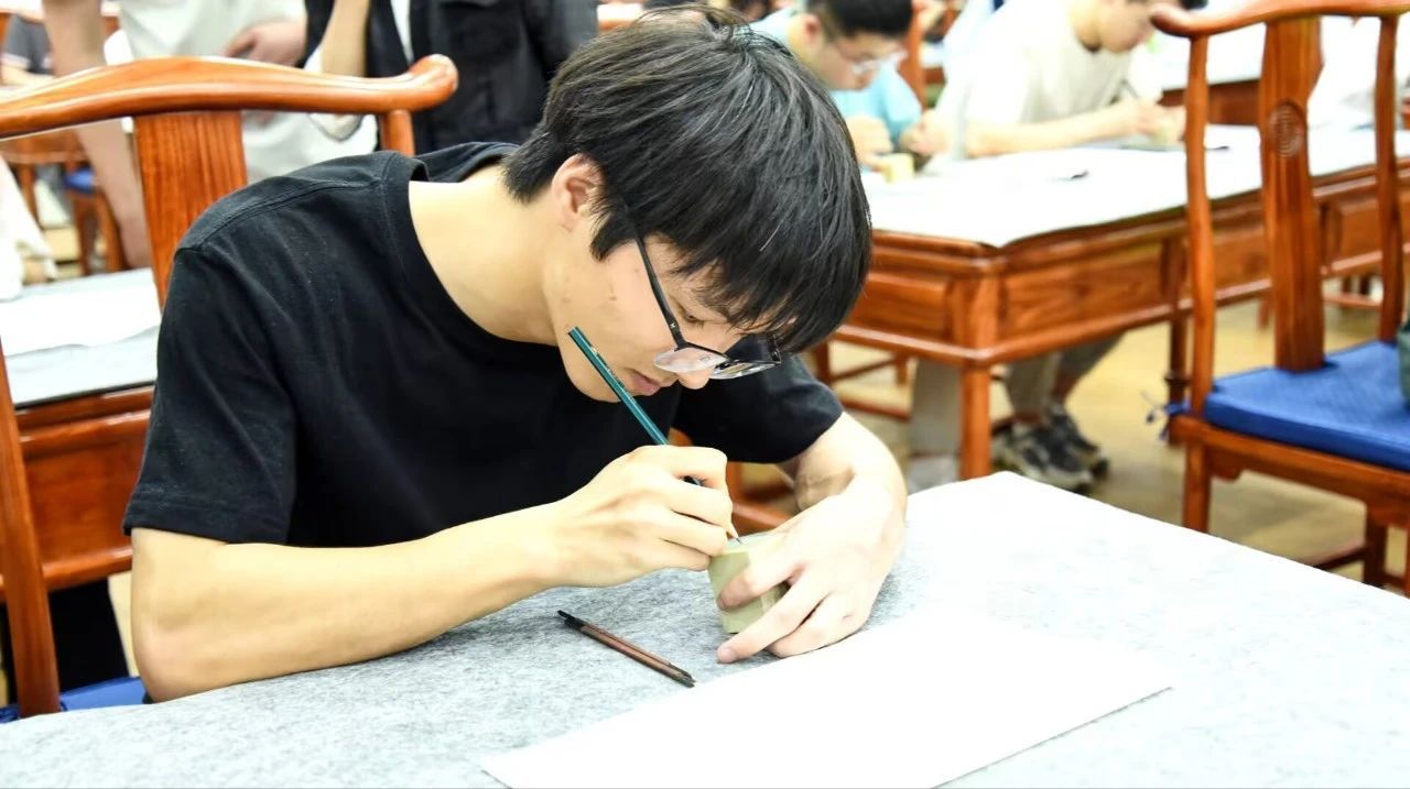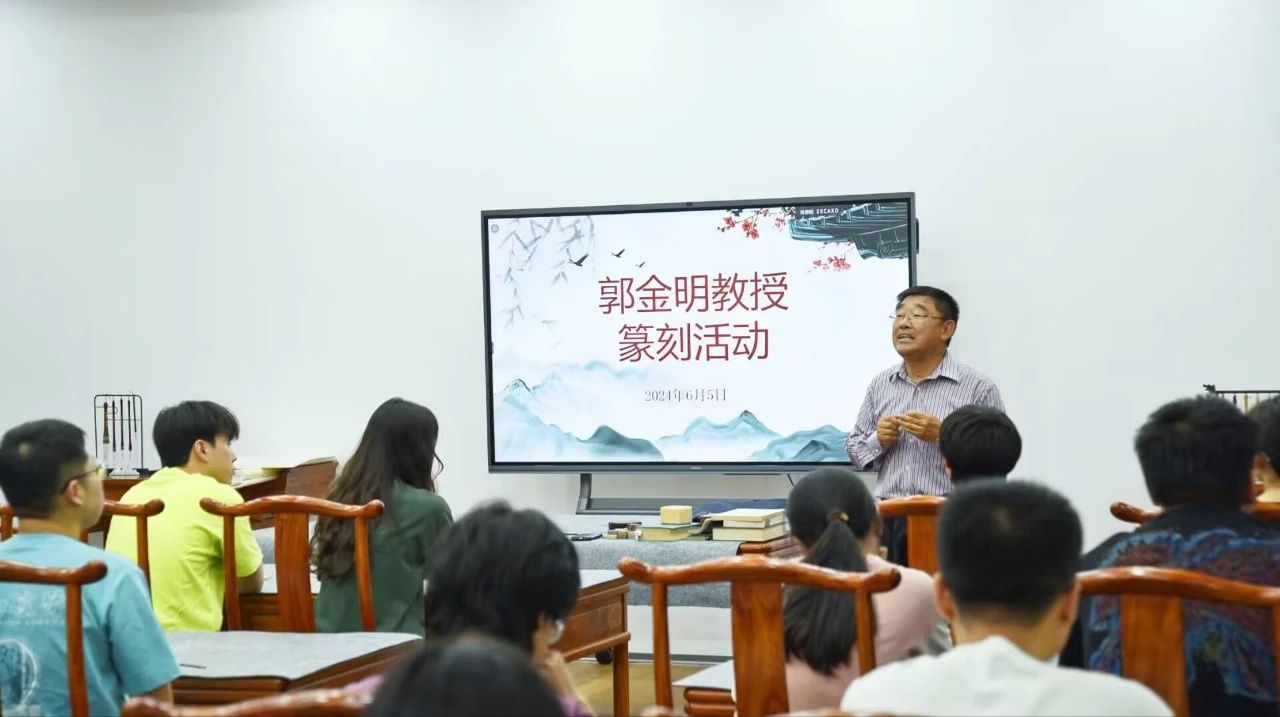 活动现场,郭金明教授在台上向大家讲授篆刻知识,同学们围坐在一起,桌面上摆放着各种篆刻工具和材料。有的同学正全神贯注地聆听老师讲解篆刻的技巧和注意事项,有的同学则迫不及待地拿起刻刀,在石头上小心翼翼地刻下第一笔。