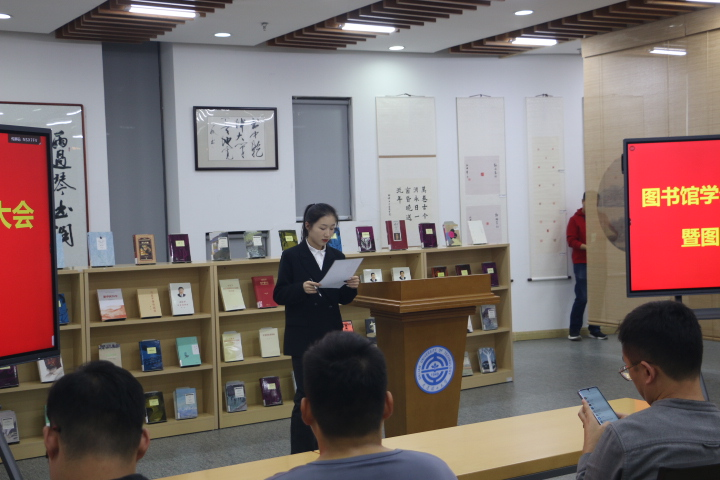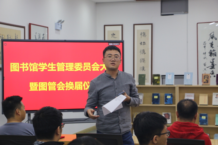 首先是图书馆学生管理委员会会长米香凝进行讲话,介绍了图管会的6个部门:勤工助学部、宣传部、巡检部、阅读管理部和档案部,宣读了新一届的图管会骨干成员名单。随后,指导老师依次为各个部门成员颁发聘书。
