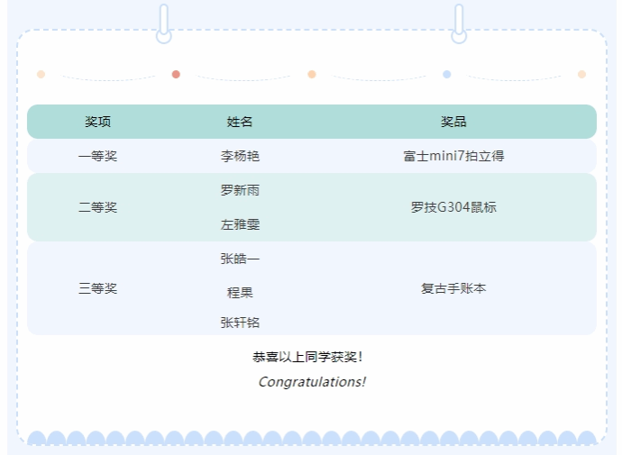 征文活动举办以来,各级同学们积极参与,我们共接收征文64篇。经评审组委会层层筛选,最终评选出一等奖一名、二等奖二名、三等奖三名。投稿的同学们快来看看新出炉的获奖名单,获奖同学记得来领取证书和奖品!