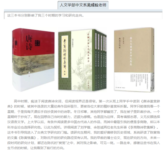 乙亥年三月,我们策划征集“大工教师阅读书单”, 即大工教师在求学做学问中对其影响最大的三本书(不限学科),目前已收到30余名教师的荐书单。老师们在百忙之中还写下了为何这三本书对自己影响深远,或者阅读三本书时的点滴故事等。人文学院龙成松老师言及“冬日祁寒,其他同学都睡觉了,我在被子里趴着抄《唐诗鉴赏辞典》……一路走来,感谢这些书在我人生节点的时候,让我看到了前行的方向。”鲐背之年的王众托教授收到征集邮件后,推荐了三本书,并附上推荐理由。其邮件内容文字练达,落款处即颂公祺二词小中见大,方显涵养。等等,在此不一一摘述,还是将书单发布给读者,人间四月天,正是读书时,让我们一起通过阅读聊表谢意,也共同拉开世界读书日的序幕,“大工教师阅读书单” 会持续征集更新,分期发布,敬请关注。