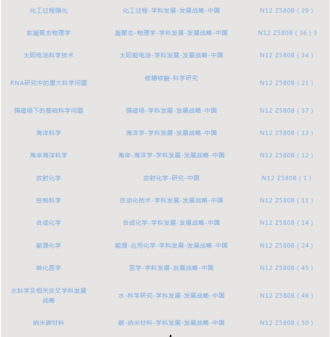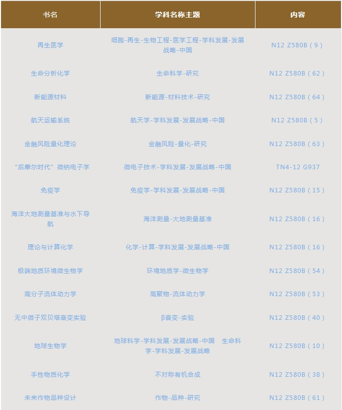 “中国学科发展战略”丛书,已经纳入“国家科学思想库—学术引领系列”,该系列在陆续出版中,目前我馆已经收藏《再生医学》等60余种。